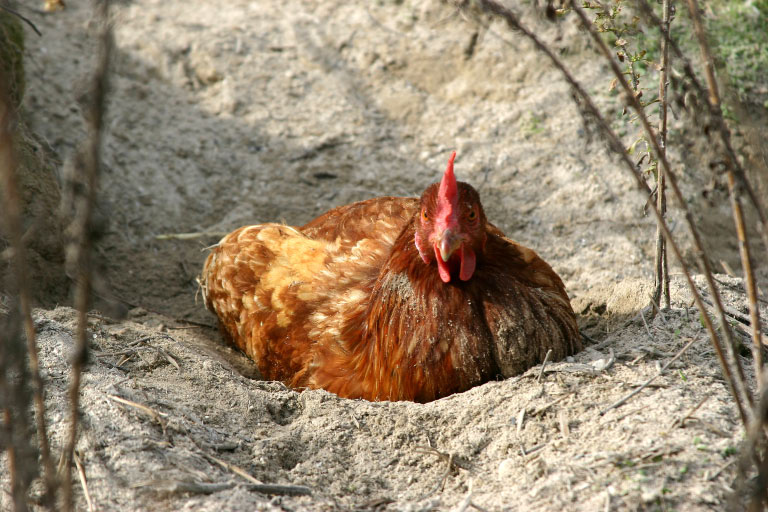 The chickens are returning to some of their summer behaviour patterns. By 7 in the morning, they are bouncing around in the hen house impatient to be released. As the sun reaches high into the noon sky, they disappear under bushes, searching for restful shade. Then they come out for more food and the first dust bath of the year.