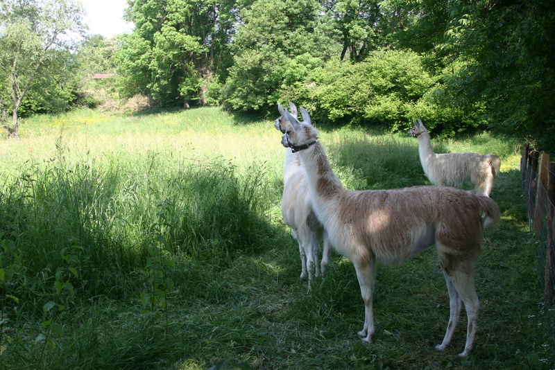 Val bravely set off round the outside of the field in the opposite direction to Duc. Spurred on by the need to avoid a bovine-camelid confrontation, she sped round to the top of the field, wading through nettles, pushing aside brambles. In no time she had turned Duc round, and after a few hesitations he came back to the gate. As he walked through, I could swear he muttered something like “That was fun!”