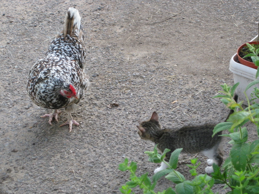 Max, not surprisingly, largely ignores them. He’s an old dog, and doesn’t allow a few birds to disturb his pursuit of relaxed comfort. The adult cats are disdainful, and pretend the chickens don’t exist. The kitten is not so sophisticated, and wants to check out these potential playmates. Of course, both chickens and cats are predatory animals and any interaction has the potential for bloody conflict.