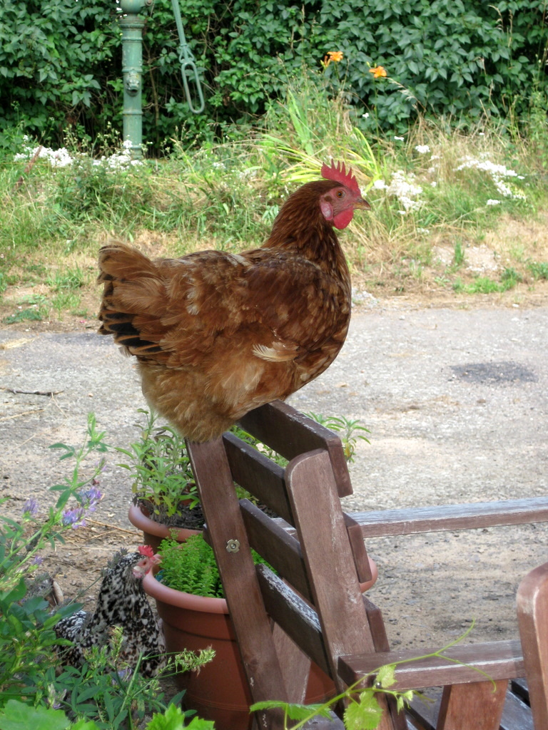 After feeding and grooming llamas, it’s a real pleasure to sit with a drink and watch the chickens pacing around, chasing bugs, pecking grain, scratching holes, and ranging free. The chickens have rapidly acclimatised, and are treating the place as their own. They’re remarkably confident birds, and I’ve had to evict them from our seats several times.