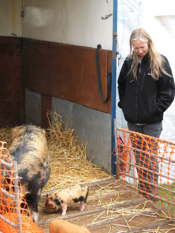 Simon lusted after big red shiny tractors and bought an Aussie Bush Hat. I lusted after all things furry and bought a rain coat. It was a showery day, but nothing could dampen our exuberant, dawn-of-a-new-life spirits. There were lots of sheared-and-blow-dried alpacas, looking ridiculous with fluffy fringes and ostrich necks, and a couple of bored llamas doing their utmost to avoid physical approaches from Mr and Mrs General Public and their Grabby Children, within the severe constraints of a two-metre square pen. There were free samples of fancy English cheeses, falconry and ferret-handling displays, and a shudder-inducing tent full of weird and feathersome poultry. There were majestic pigs winning prizes and homely pigs rolling in mud baths. And there was a short, fat, round, hairy ginger and black pig with a squashed nose, snuffling about in a straw-bedded trailer, surrounded by squeally, multi-coloured bundles of snouty joy.