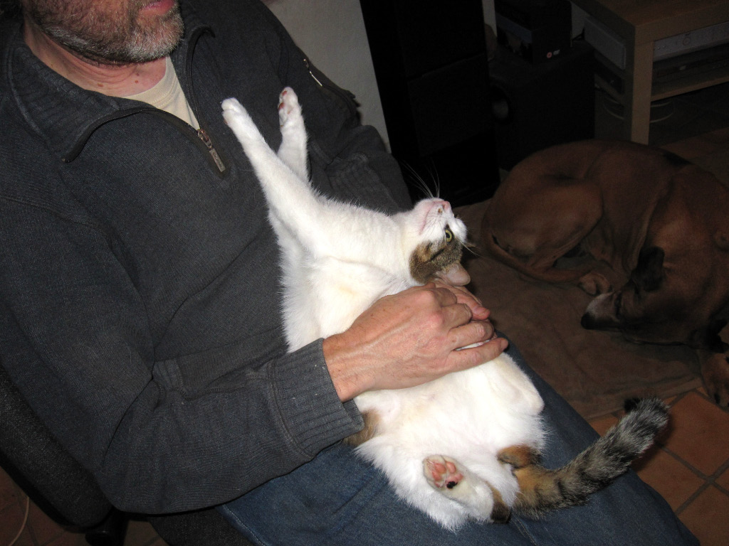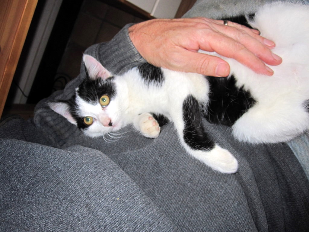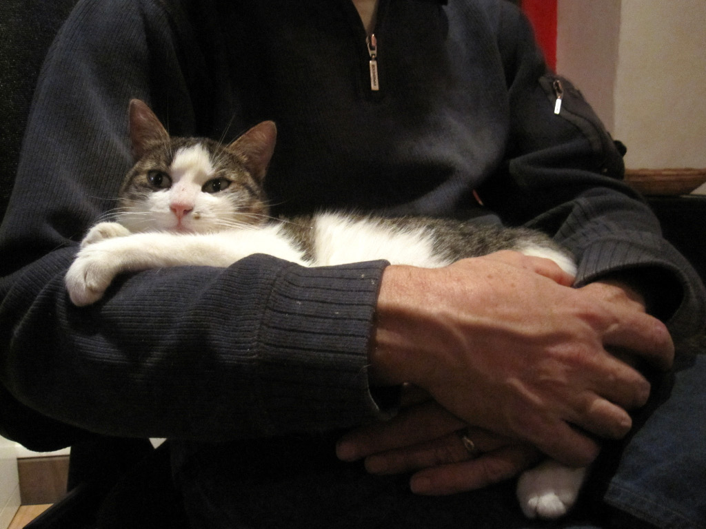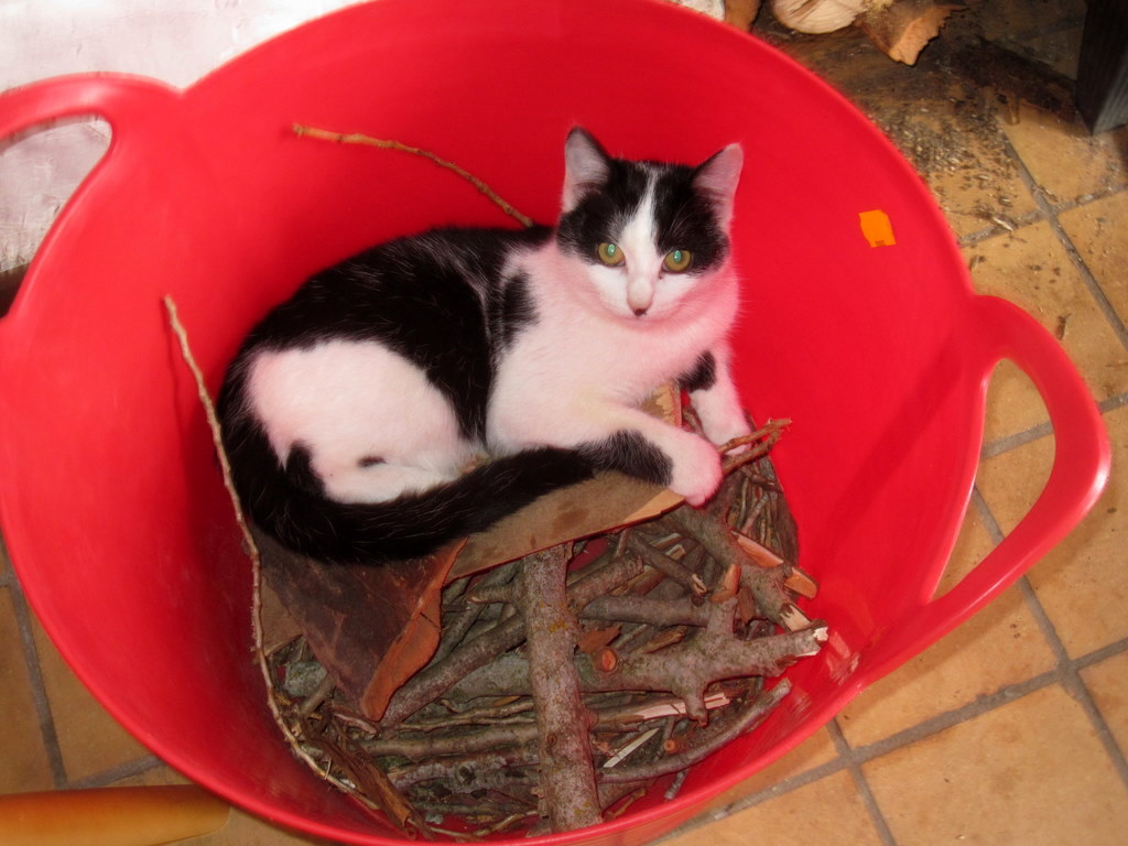 This was a monicker assigned in the early days to distinguish her from her similarly coloured black-and-white brother Tom (who was actually first christened Spade-head by me, but Simon didn’t like that name – I can’t think why). She has all the attractive physical attributes of her brother without the down-sides. She is very fluffy and furry and soft, and unbelievably cuddly. She cleans herself meticulously. She follows you around and leaps deftly and unnoticed into your lap, to stare adoringly into your eyes. She is the guardian of the kindling wood. The only time when Stubbs is not surreptitiously stealing pieces of wood from the bucket to chew into a hundred vacuum-cleaner-hose-blocking chunks, is when Stripe is sleeping in it.