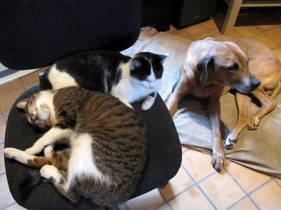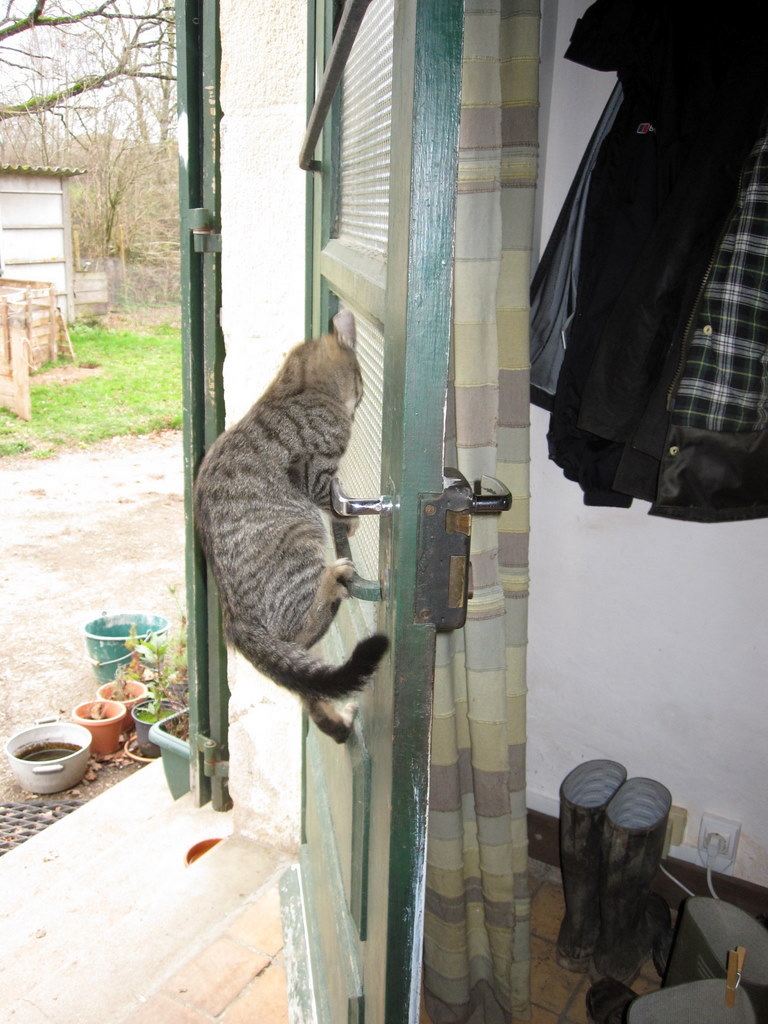 is the undisputed queen of door-opening. Blue can do it too, but with less finesse. Brown is so good at opening the front door that we have to lock it at all times to stop her letting herself and the other cats (and sometimes the chickens) into the house, and letting the ever-ready puppies out. Brown is so good at it, that the other cats queue up at the door and ask her to open it for them, which she will do, even if she doesn’t want to come in herself.