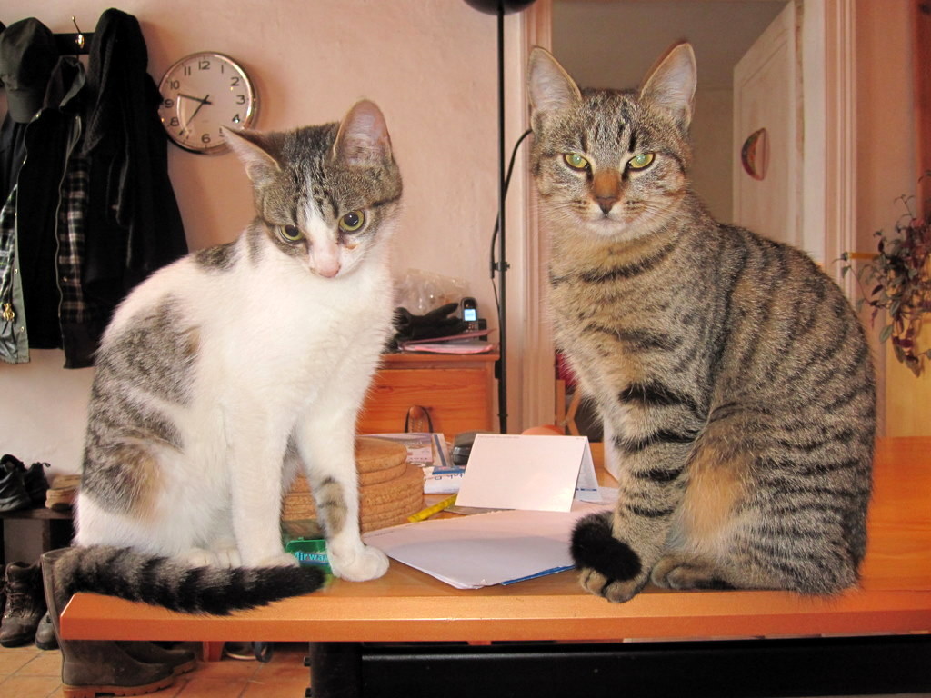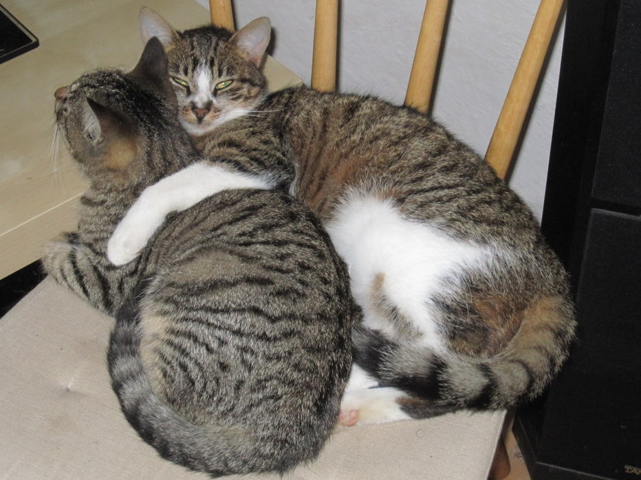 Then there are the Two Tabbies. Virtually identical tiger twins, impossible to tell apart at a quick glance. They are named Blue and Brown. When they were very little, Brown had orange tinges to the edges of her fur, and Blue, by comparison, was grey. But as they matured, Blue also, and very inconsiderately, became more brown. Now they are really only distinguishable by a slight difference in the lines on their faces, and by their behaviour.