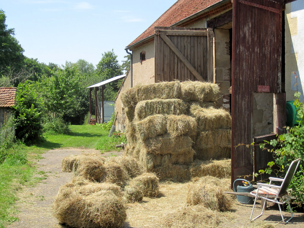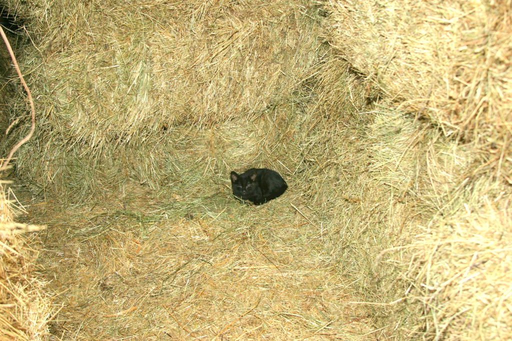 A little later, when Florian arrived with this year’s hay, and we commenced the gruelling, sweaty, spiky task of unloading the bales from the truck, and carrying them one by prickly-heavy one to the upper barn floor, Barn Cat had vanished. Only little Black remained, skulking fearfully in the shadows, as its home was invaded and rearranged, and slowly filled with pillars and walls of gold.