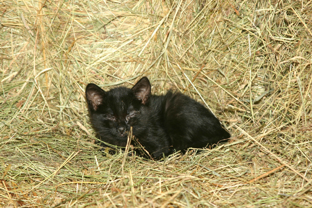 Yesterday morning, Simon went out to the barn early to move the old bales of hay, and make ready for our new delivery. Only the blackest black kitten was to be seen – still lurking in the dark upstairs of the barn, from whence it has not moved since birth. A little later, I went out to clear a space behind the barn doors, and found Barn Cat standing at the bottom of the stairs with a huge mouse in her mouth, calling to little Black, who paced up and down along the edge of the upper barn floor, miaowing pathetically. There was no sign at all of any of the other three kittens.