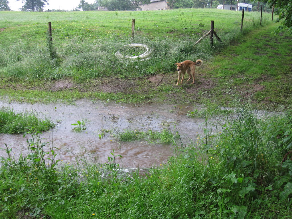 The trouble is that the valley in which the stream flows is too wide to make a simple little bridge possible. The land alongside the stream itself gets very soggy, and in June the whole area became flooded.