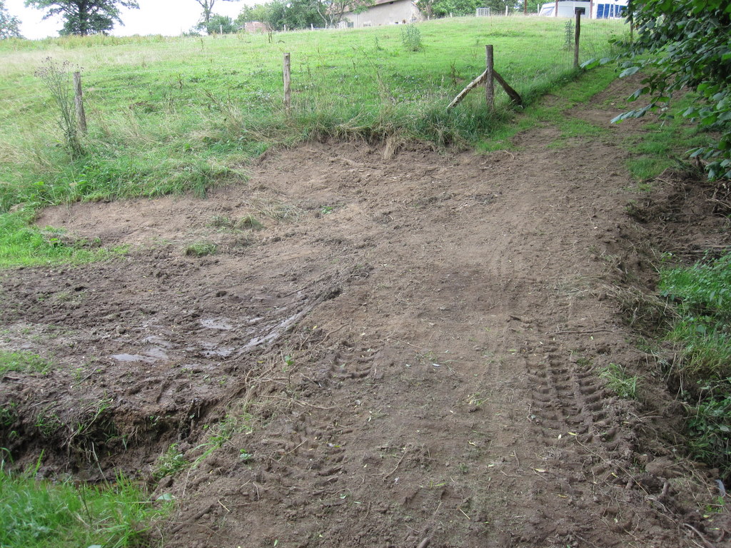 To reach the Willow Field, where Pedro and Ana are living, or to get to the path under the hazel trees that provides an essential part of our ‘parkland walk’, it is necessary to cross the stream. On foot, this is no problem (especially since Val improvised some plank bridges). However, with the tractor, unless the weather has been dry for some time, there is a real danger of bogging down in a great depth of sogginess. Although the tractor does always get through, the muddy, rutty mess left behind is pretty horrendous.