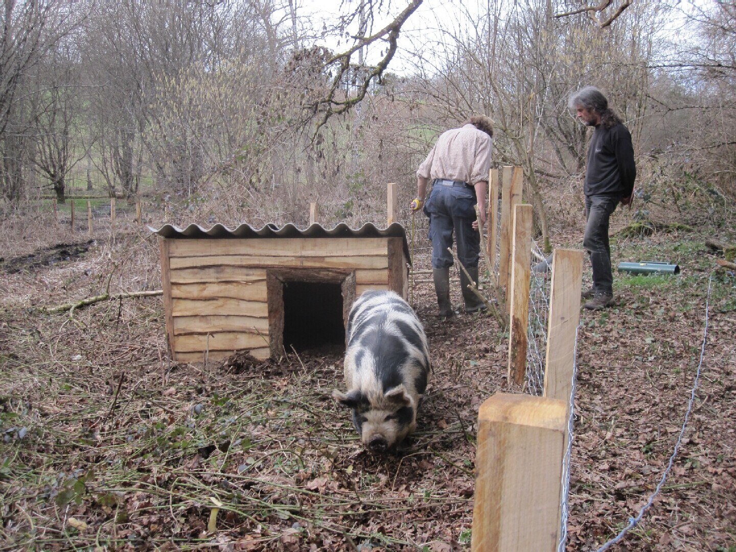 But whatever the undulating tribulations of the journey, the jolly threesome arrived at their destination with their appetites and curiosity intact. And an inspired combination of four people, an excited small child, two sheets of plaster board, a shaken bucket and a trail of sliced carrot was all that was required to move the curious cochons the hundred-or-so interesting, muddy, stream-sided metres from the trailer to their freshly-created enclosure, on the far side of the goat-and-chicken pen. With the last piggy inside the pen, Steve (camp-site owner and pig-servant-in-training) set about finishing off the elegant wooden gate that he had skilfully magicked up only moments before our arrival, with the all-important addition of a big-bolt-to-close-it-with, whilst the Impertinent Three set about demolishing the unsuspecting vegetation, and their beauteous-but not-quite-big-enough new house.