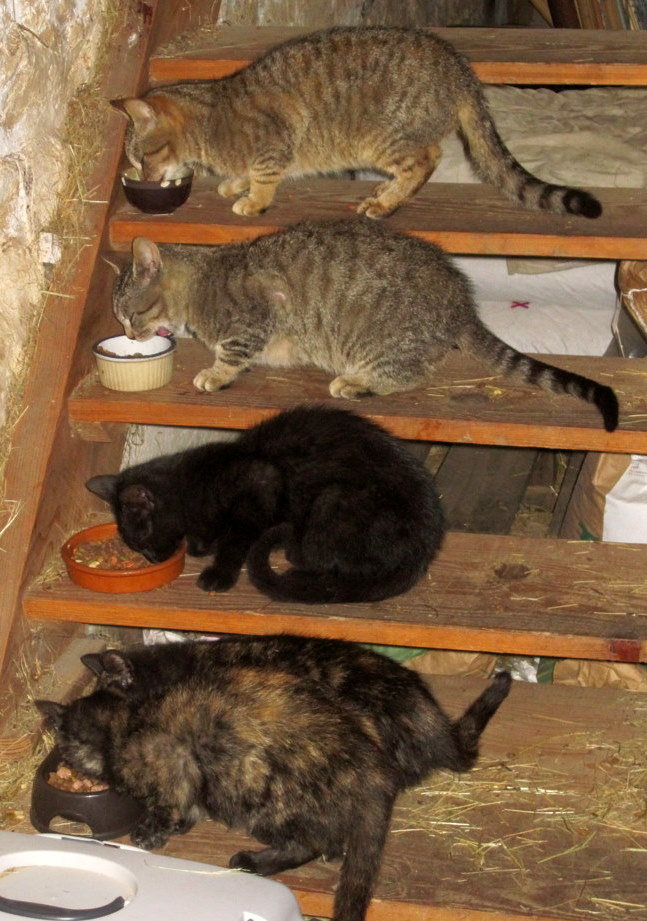 They’re hardy and resilient little things, and have soon settled back into their relaxed lifestyle. Of course, they do have to run and hide when the dogs come hurtling round a corner, but most of the time they have a very pleasant life. It’s no wonder they have not moved on – it’s hard to imagine that they would readily find someone else who would line up a series of bowls of top-quality cat food. And then watch contentedly while they scoffed it.