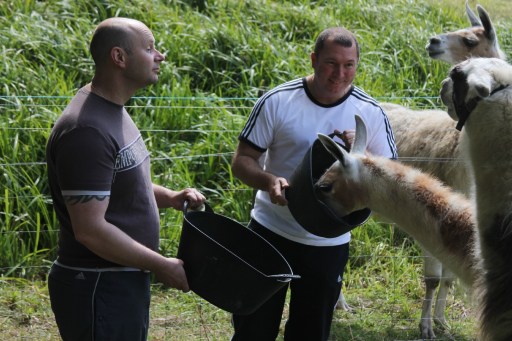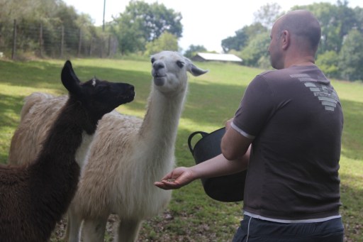 Well, obviously, they got here in the end. And after a brief resting period drinking beer and wine, and discussing the oh-too-frequently unacquired taste of olives, Colin mentioned that he couldn’t wait to meet the llamas. So off we all trotted, bouncy dogs in tow, to do the rounds and make the introductions. And Colin asked Duc and Valentine if they knew they were famous, and told them that he had seen their pictures on the blog. And Duc and Valentine said “Stop rambling man, and give us some more food” And Ana gave Colin a kiss, because Ana is easy and Anna is anybody’s. And Lenny COULD NOT BELIEVE there were EVEN MORE people taunting him over the gate and trifling with his women, and – WHAT’S THIS? Residing – yes ACTUALLY RESIDING NEXT TO HIM – in that weird caravan thing just the other side of his fence.